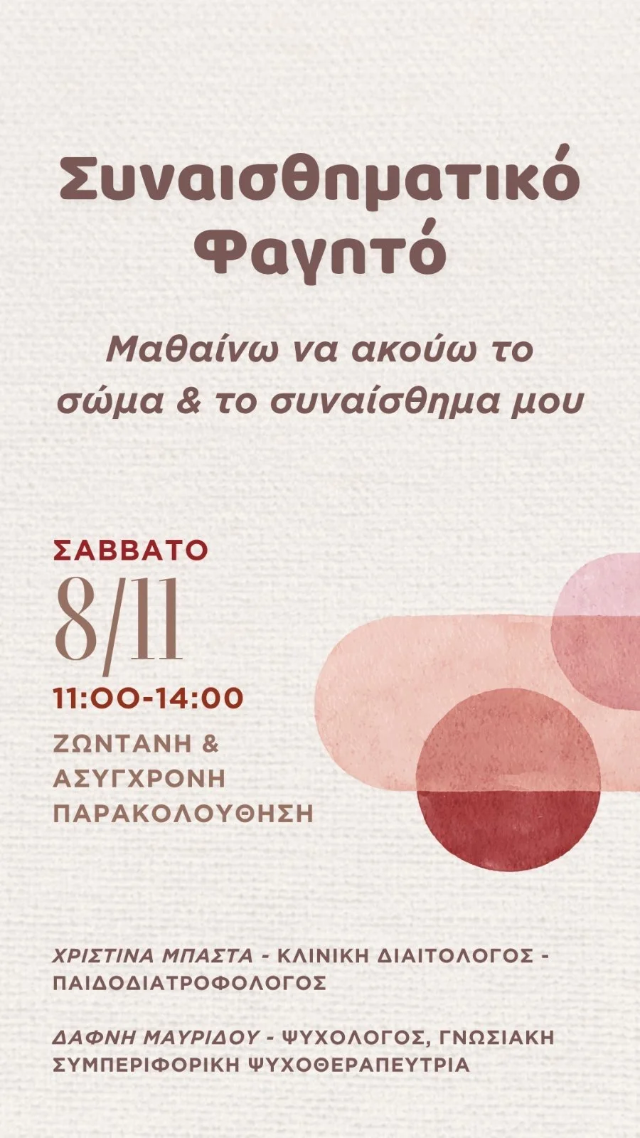 💡 Αφορά όσους θέλουν να κατανοήσουν καλύτερα τη σχέση τους με το φαγητό και να κάνουν ένα βήμα προς μια πιο ισορροπημένη καθημερινότητα.
